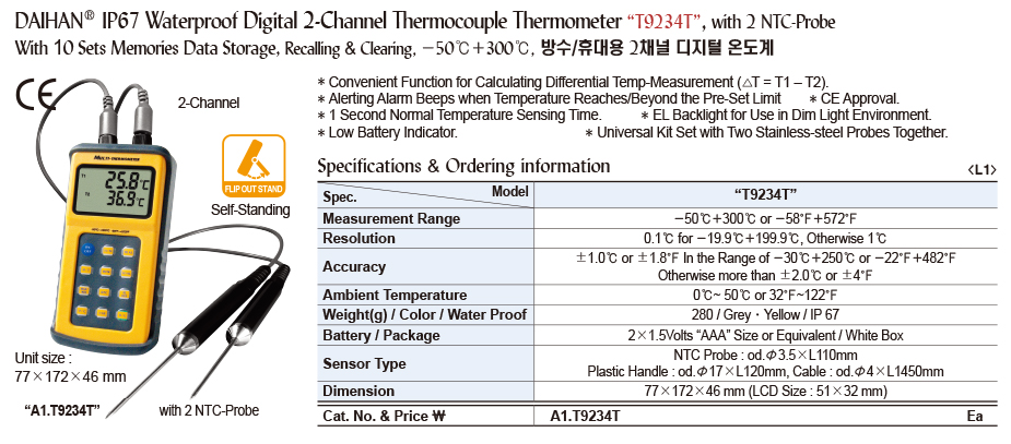 Nhiệt kế điện tử 2 kênh, Daihan, -50℃+300oC
